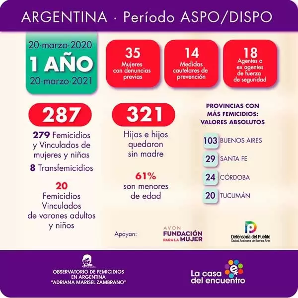 Como información adicional se detalló que 35 de las víctimas habían realizado denuncia, 14 femicidas tenían dictada una medida cautelar de prevención y 18 femicidas eran agentes o ex agentes de fuerzas de seguridad.
