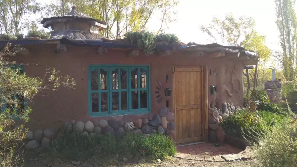 Las construcciones son mixtas, “de mucha construcción natural, de reciclado y mucho convencional; porque uno iba haciendo en la medida que iba aprendiendo”, confesó. Se utilizó “mucho barro” para la construcción. Algunas casas tienen calefones solares, energía solar o “algún pozo con bici bomba”.