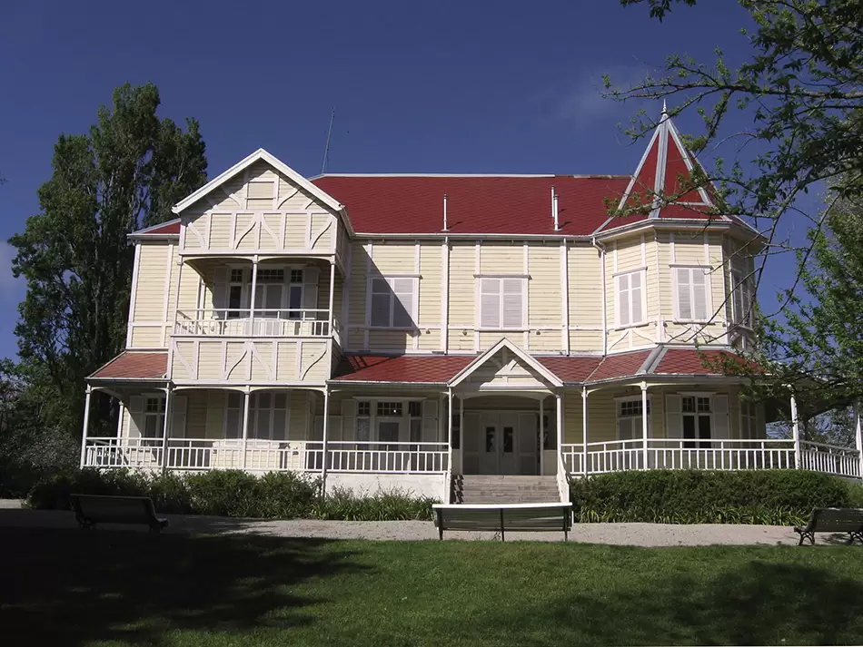 Al traspasar la entrada, la casona sorprende. Sus techos con tejas rojas a dos aguas cubren las paredes de madera amarillo pastel. El armonioso conjunto se completa con sus puertas, balcones y barandas pintados de blanco. Alrededor, un prolífico jardín con caminos de piedras y árboles verdes plantean una gran duda a les turistes: ¿por dónde arrancar el recorrido?