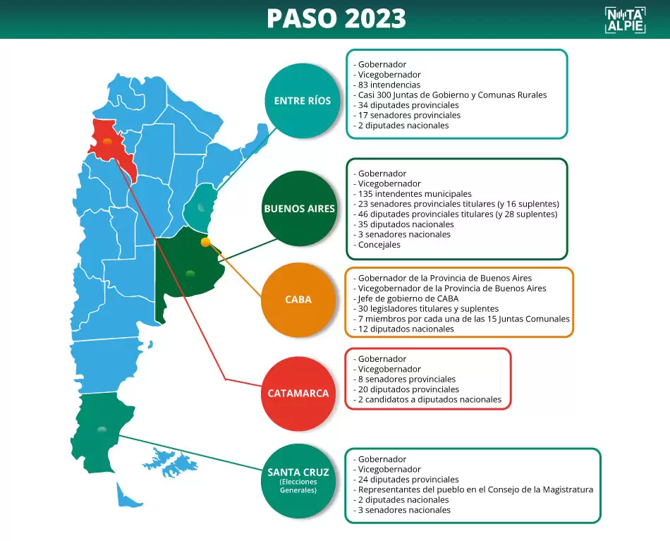 Sin embargo, en simultáneo, la Ciudad Autónoma de Buenos Aires (CABA) y las provincias de Buenos Aires, Catamarca, Entre Ríos y Santa Cruz elegirán a sus representantes locales para la gobernación y las bancas provinciales.
