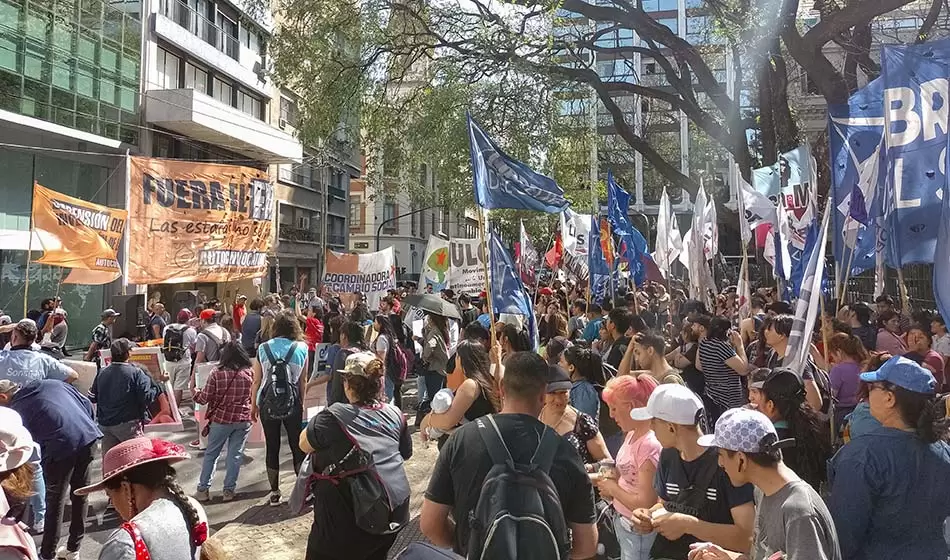 A las 14, la vereda de la Plaza Libertad de la Ciudad Autónoma de Buenos Aires (CABA) estaba repleta. Allí se encuentra desde 2019 la oficina del Fondo Monetario Internacional en Argentina.