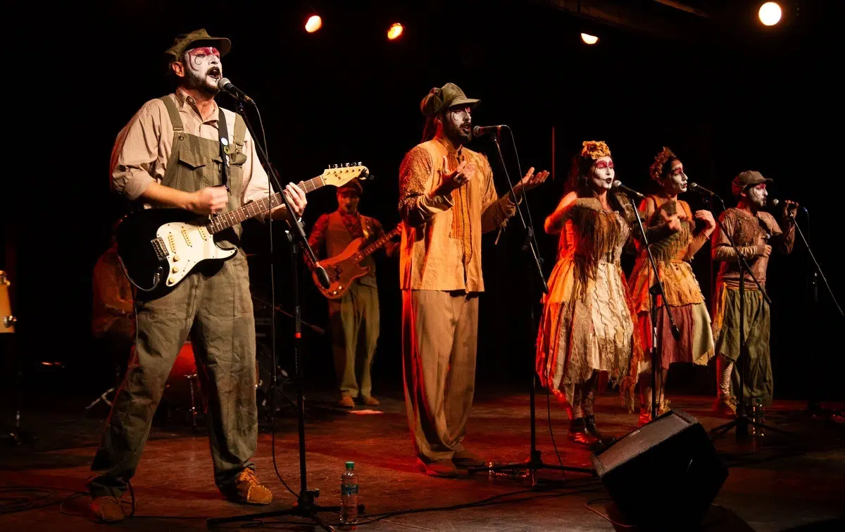 El formato es particular: seis voces que arman un coro murguero al estilo uruguayo, acompañadas por guitarra acústica y eléctrica, bajo y batería. La combinación genera algo nuevo, una especie de murga-rock que funciona. Las voces son hermosas, los arreglos están bien trabajados y la banda suena compacta. El vestuario y el maquillaje completan el cuadro: trajes coloridos, sombreros llamativos, una puesta que mantiene la atención del público de punta a punta.