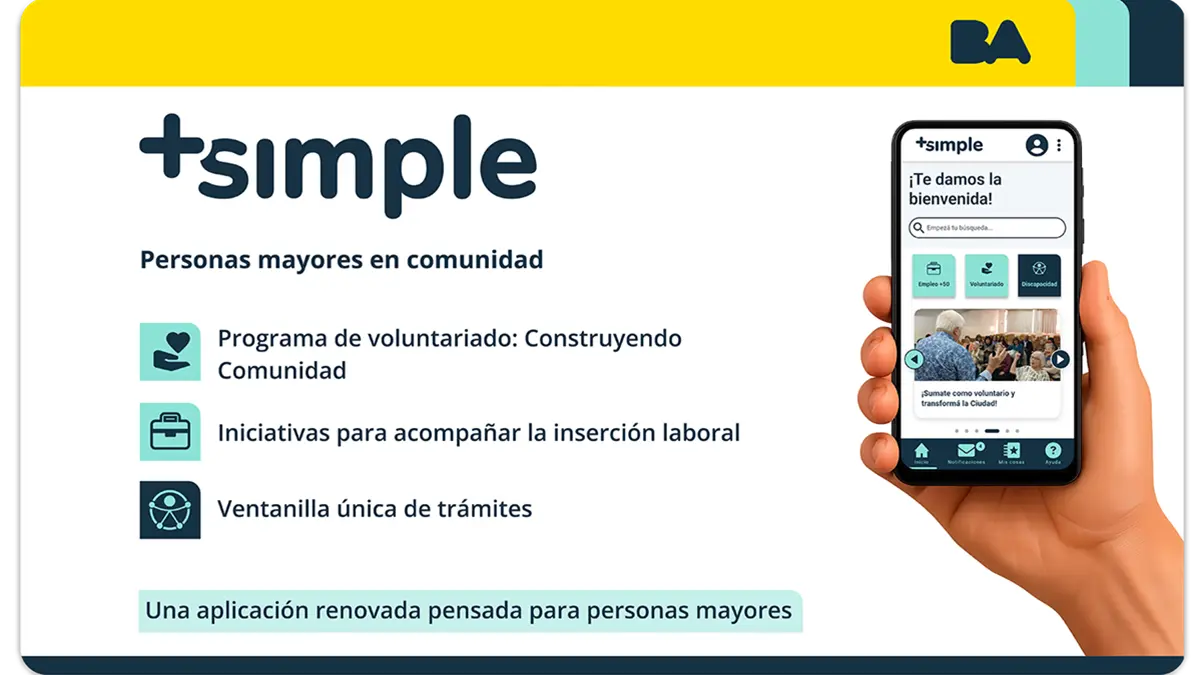 A través de +Simple, las personas mayores pueden acceder a una agenda cultural actualizada, con espectáculos, talleres y visitas guiadas, beneficios en rubros como salud, gastronomía, turismo y comercios de cercanía, y propuestas de formación vinculadas a inclusión digital y bienestar.
